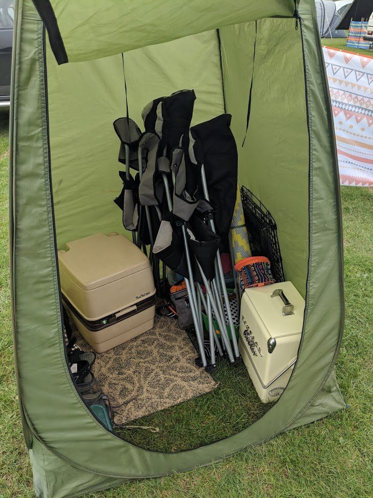 However, if you're not staying in the same place for multiple nights - it can sometimes be more hassle than it's worth putting up a big awning - for these occasions we have a 'toilet tent' - the pop up ones are great - go up easy, and you can throw all your 'bits' in out the way - (just makesure you can still get the loo for when you need it though!)